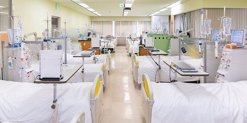 - 40床の透析ベッドがあります。3F透析センター内にある階段か専用エレベーターでの移動となります。24時間通信システムにつながれた純水装置や溶解装置など透析に必要な機器が置かれています。